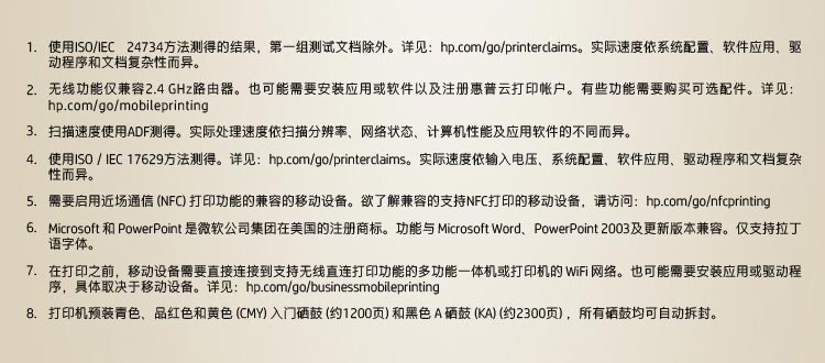 黑白 (正常模式,A4):高达27份/分钟;黑白 (正常模式,letter):高达28份/分钟;彩色 (正常模式,A4):高达27份/分钟;彩色 (正常模式,letter):高达28份/分钟;黑白双面打印 (A4):高达24份/分钟;黑白双面 (letter):高达 25 份/分钟;彩色双面打印 (A4):高达24份/分钟;彩色双面打印 (letter):高达 25 份/分钟 |